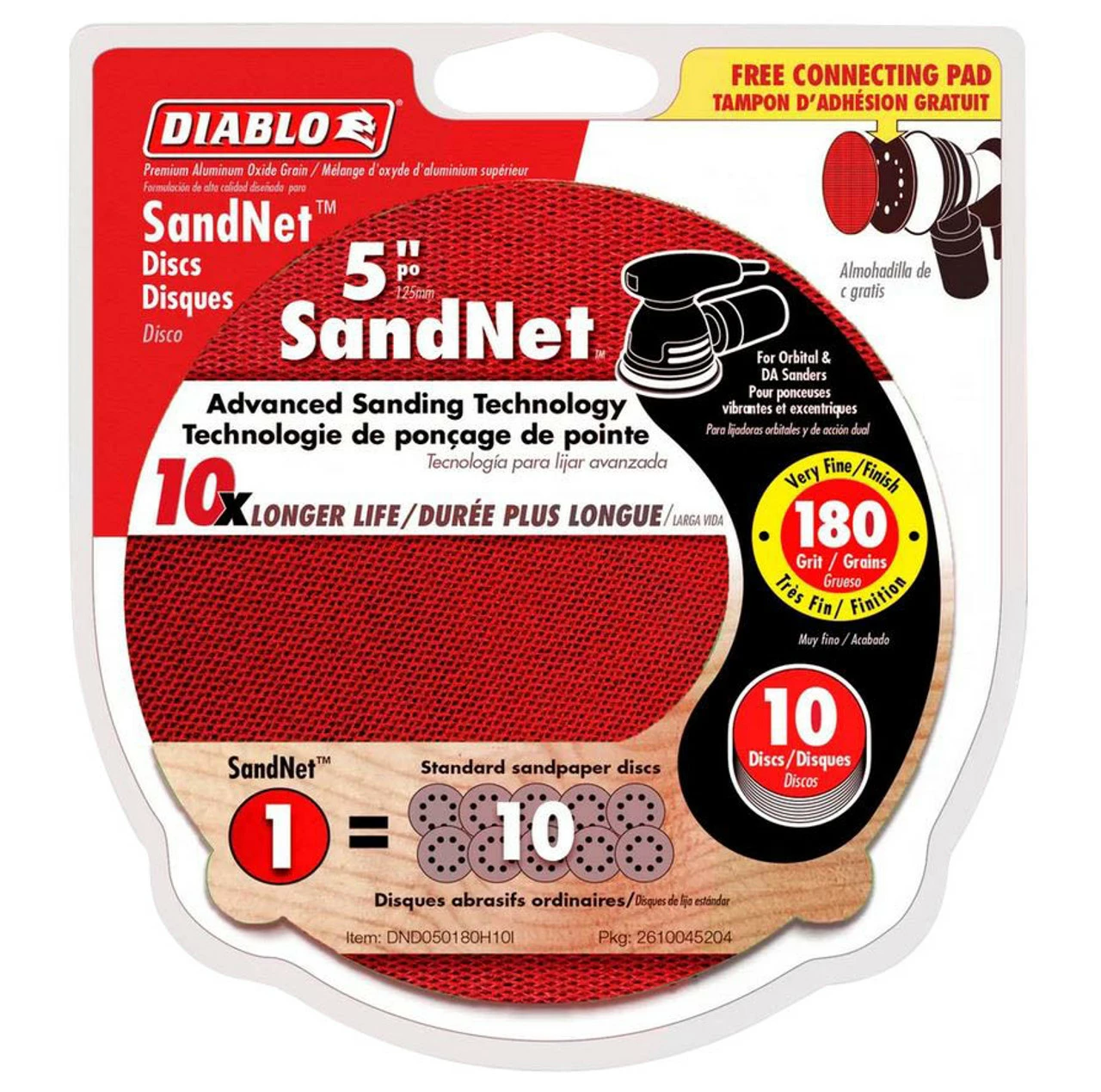 Diabloβs new SandNet discs with reusable sanding technology are the most advanced sanding discs on the market with 10x longer life versus standard sanding discs. Each SandNet discs features a clog-reducing net design coated in premium aluminum oxide grit for fast material removal while reducing material build-up. The SandNet design is easy to clean and reuse multiple times by simply shaking, vacuuming, or rinsing the disc to remove any build up. The 10 pack of SandNet discs includes a free connection pad (a $5 value) for easy attachment to tool. Ideal for sanding wood, metal, plastic and solid surfaces.
