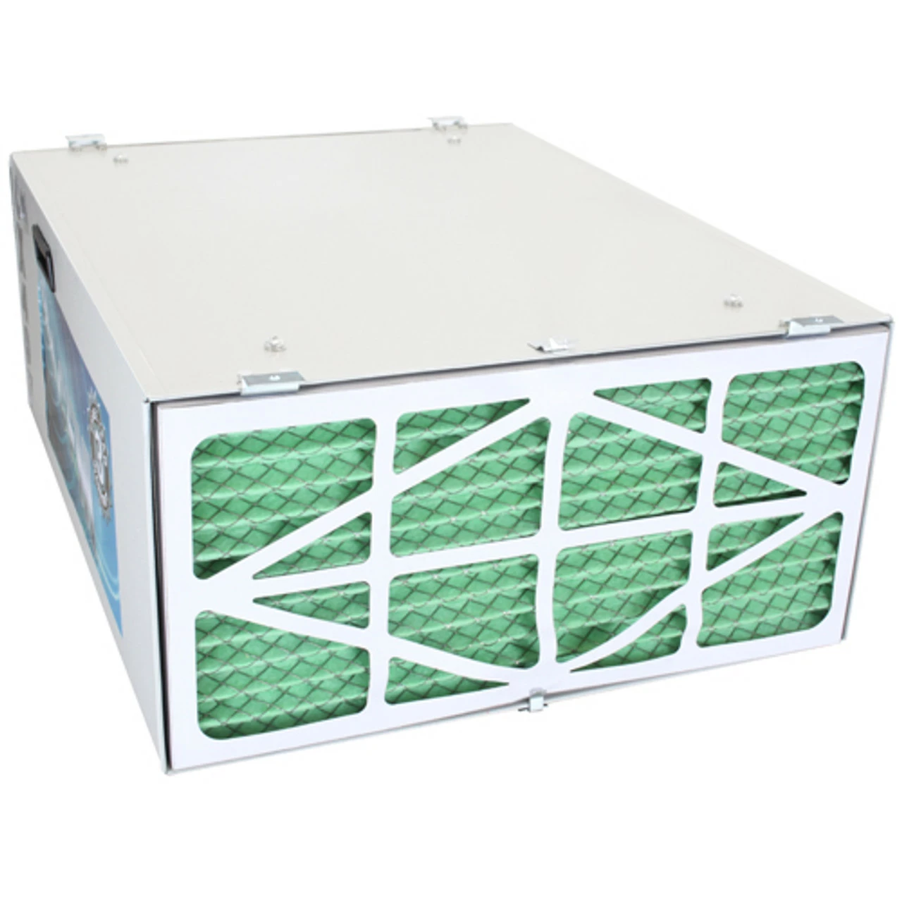 Featuring a 1/5HP Motor with 3 speeds, this air cleaner filters the air first with the 5 micron primary filter and then with the 1 micron secondary filter keeping it clean and free of dust. The air cleaner comes with four eye bolts which allow hanging it from the ceiling and you can control the duration and speed with the remote control as far away as 40 feet.