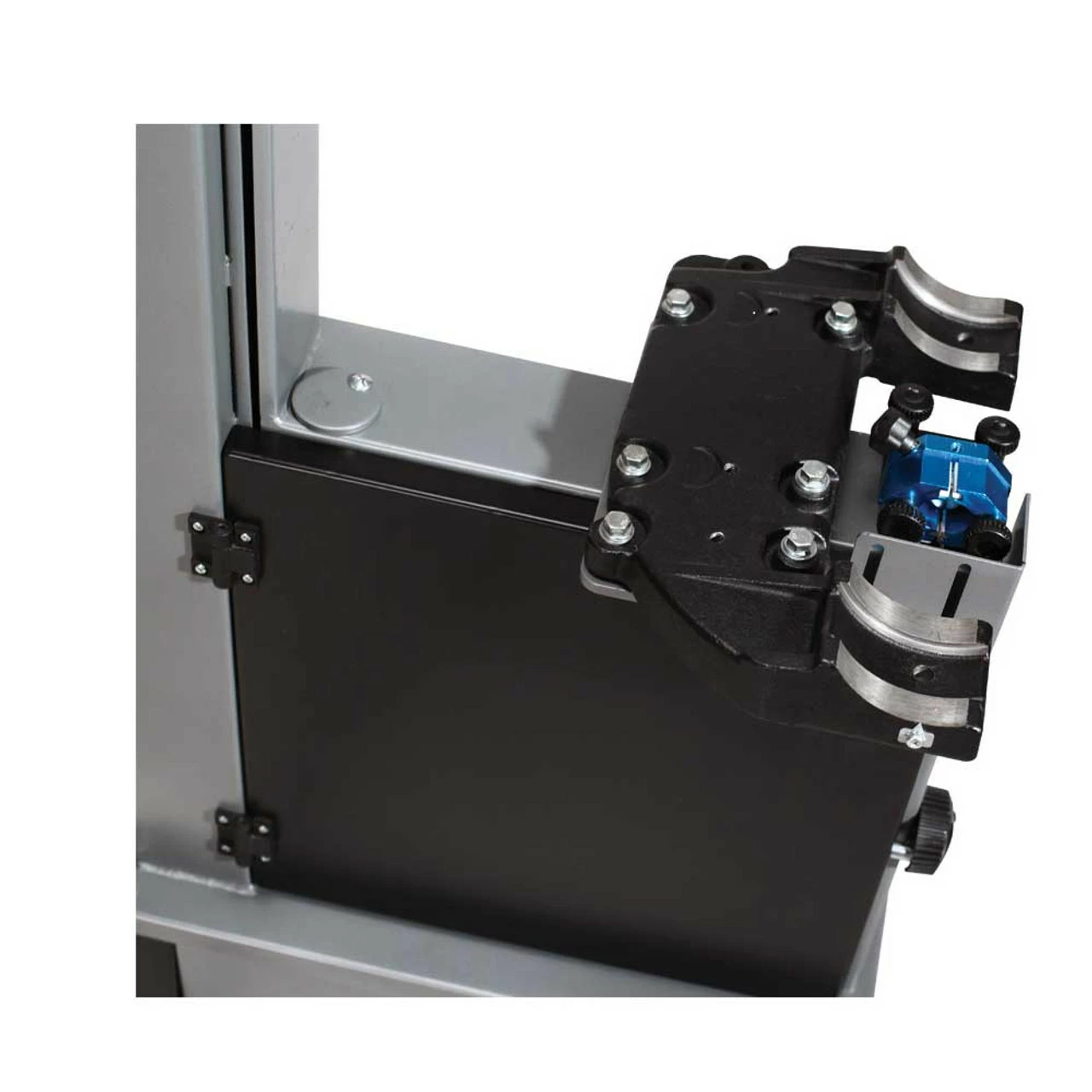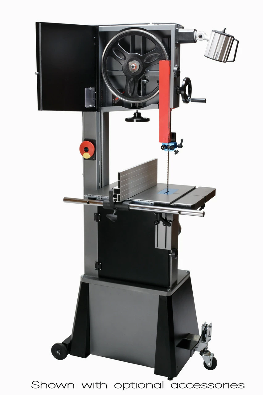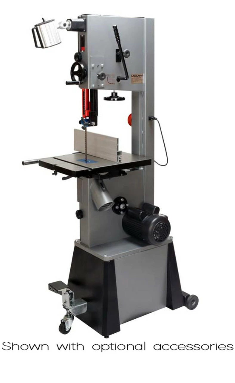 The 14|12 Bandsaw is a 110 Volt saw that feels like a 220. Features include a pyramid-shaped spine, 1 ΒΎ HP TEFC Motor, quick release tension, 115-volt outlet, and micro-polished 21 X 16β³ table mounted onto oversized Trunnion paired with Aluminum Hi/Low Fence. Solid Cast Wheels are electronically, dynamically balanced & fitted with polyurethane one-piece tires designed to run cooler & last longer than conventional tires. The worm gear & pinion is ultra-smooth and engineered to have minimum flex even when fully extended. This is a trademark of Laguna, just like the famous ceramic Laguna guides. Double windows allow you to check both tension & tracking while the machine is running.