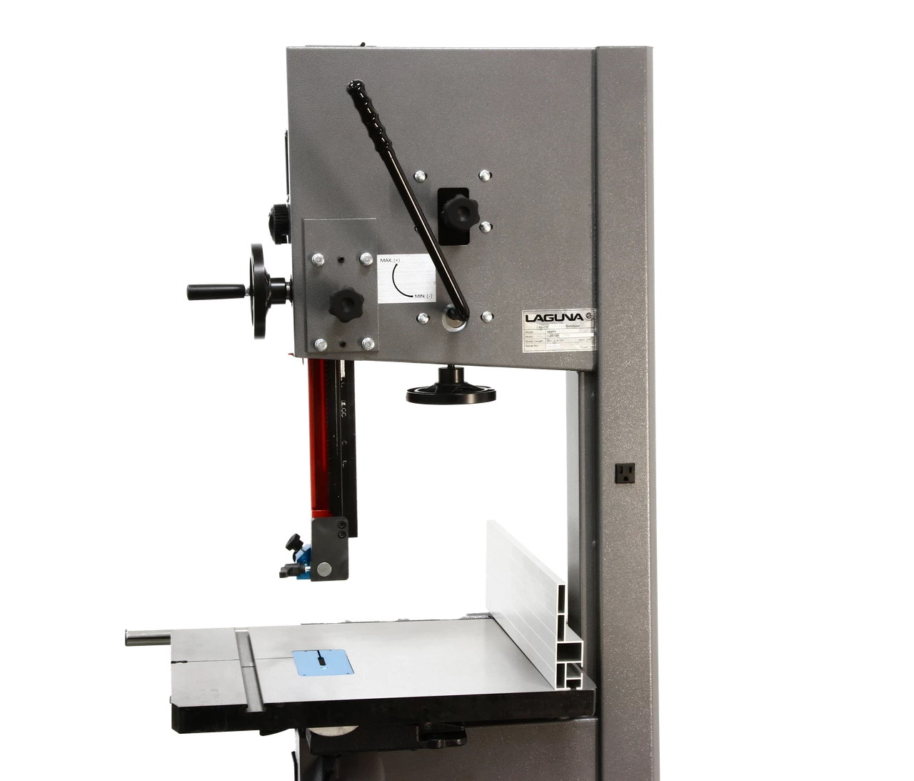 Like the 14|12 Bandsaw it is a 110 Volt saw that feels like a 220. Features include a pyramid-shaped spine, 1 ΒΎ HP TEFC Motor, quick release tension, 115-volt outlet, and micro-polished 21 X 16β³ table mounted onto oversized Trunion paired with Aluminum Hi/Low Fence. Solid Cast Wheels are electronically, dynamically balanced & fitted with polyurethane one-piece tires designed to run cooler & last longer than conventional tires. The worm gear & pinion is ultra-smooth and engineered to have minimum flex even when fully extended. This is a trademark of Laguna, just like the famous ceramic Laguna guides. Double windows allow you to check both tension & tracking while the machine is running.