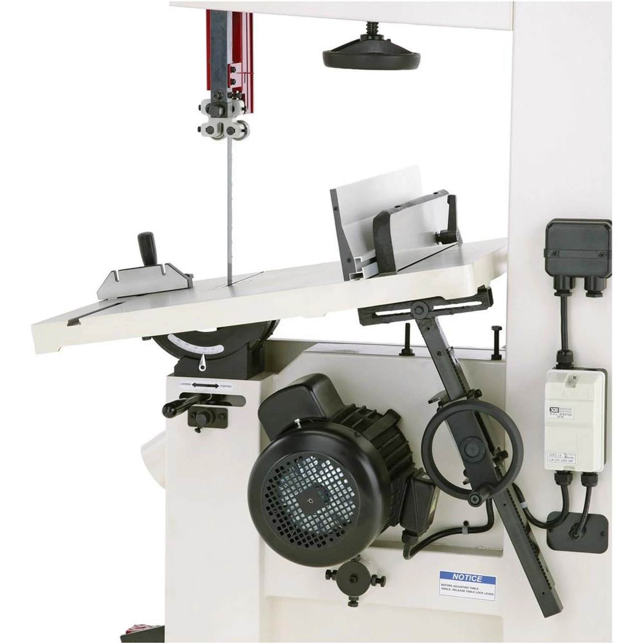 This 21″ Bandsaw has the power and capacity to handle any bandsaw cutting operation with ease. Its 5 HP motor powers blades up to 1-3/8″ wide through the hardest wood up to 14″ tall. Rigidly constructed to tension the widest blades, this bandsaw eats through wood like a mini saw mill. Features include micro-adjusting rack-and-pinion table tilt, ball bearing blade guides, blade tension indicator, foot brake, deluxe fence with 2-position resaw fence attachment, and precision-ground cast-iron table. You couldn’t ask for more.